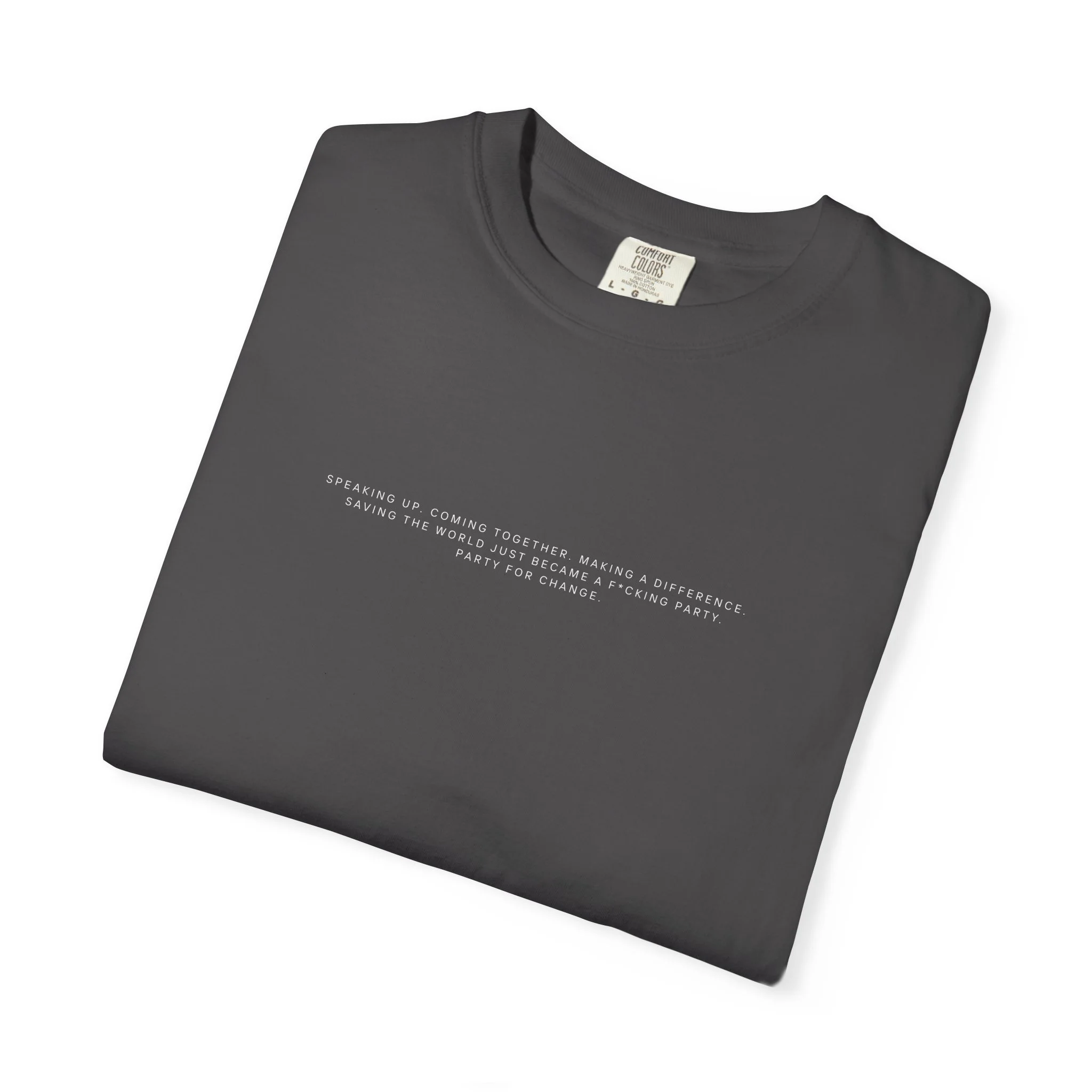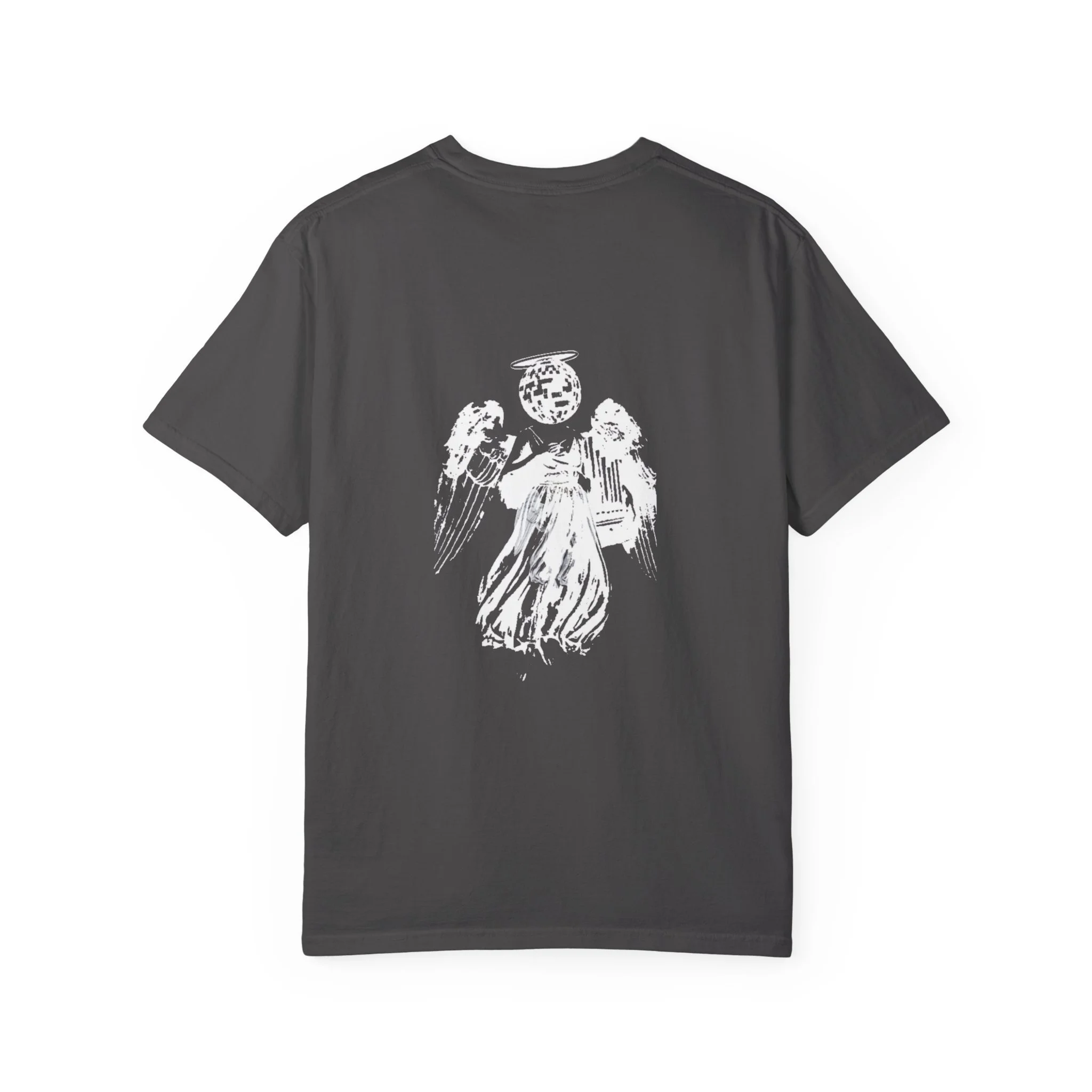 A relaxed, garment-dyed tee with a quiet, worn-in feel and a striking, hand-sketched graphic. The front carries a small, subtle line of text across the chest; the back features a bold, ghostly angel illustration rendered in high-contrast white against deep charcoal. It sits loose on the body, drapes softly thanks to the post-dye softness, and keeps its shape with double-needle stitching. This shirt reads like a piece of personal armor for late-night city wanderers and music-heads—comfort that still says something. Reach for it when you want an underplayed statement: layered under a denim jacket at a rooftop show, pulled on for a long train ride, or worn at a low-key gallery opening. The heavyweight cotton gives it structure, the garment-dye adds lived-in texture, and the roomy fit makes it effortless to move and breathe.